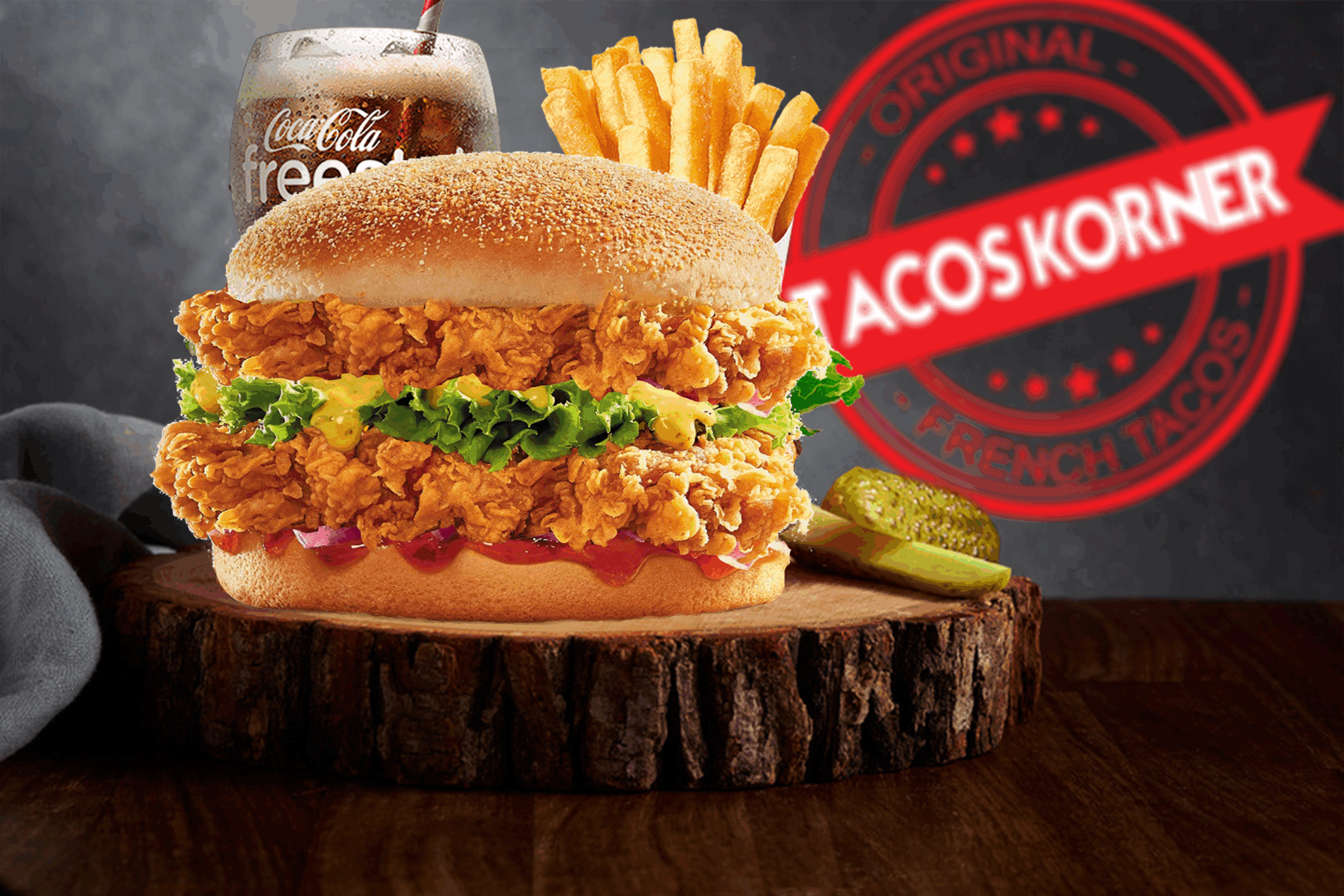 Burger maison garni avec double poulet pané, cheddar, salade, tomates, oignon et sauces au choix.